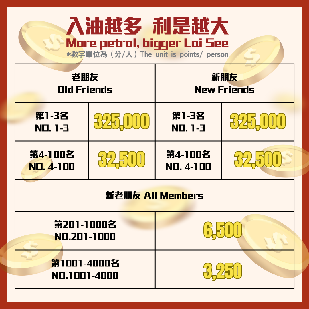 3. 獲獎資格及獎品内容:積分利是按活動期間入汽油量進行排名,分階梯發放對應積分,詳情如下: