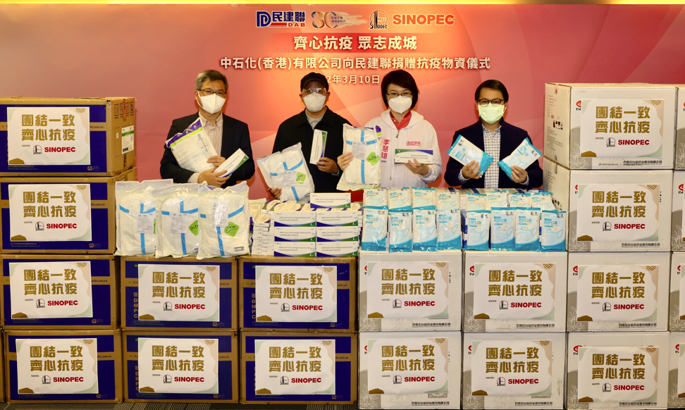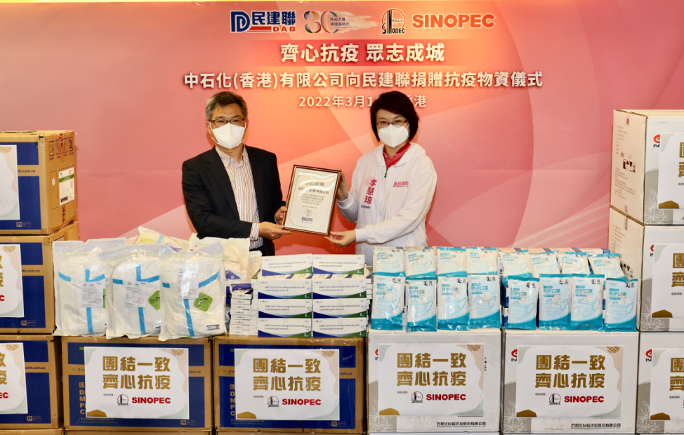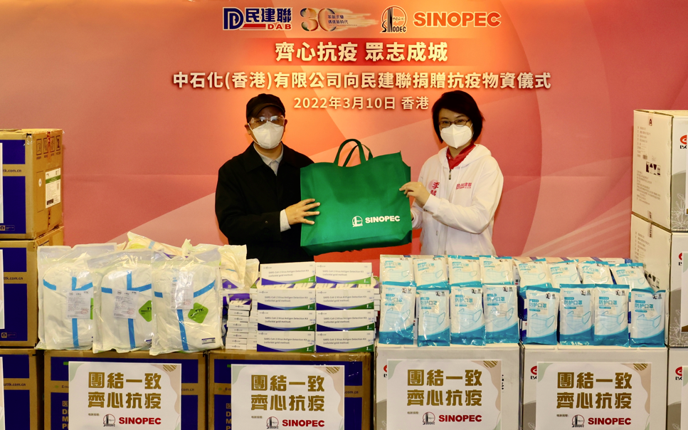 3月10日,香港公司與香港民主建港協進聯盟(民建聯)舉辦捐贈儀式,再度捐贈60000盒防疫藥品、6000套高等級醫用防護服,30000個外科專用口罩及3000個快速檢測盒,總價值約200萬港元的防疫物資通過民建聯免費派發給香港一線的抗疫工作者、基層市民及有需要人士,與他們一道守望相助、共克時艱。民建聯主席、香港立法會議員李慧琼、民建聯副主席、香港立法會議員陳克勤,中國石化香港代表處總代表蔣振盈、公司總經理李繼從出席捐贈儀式。