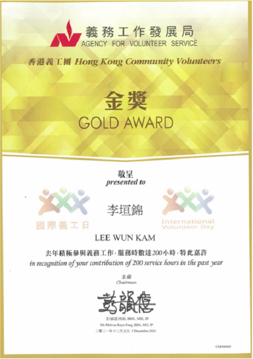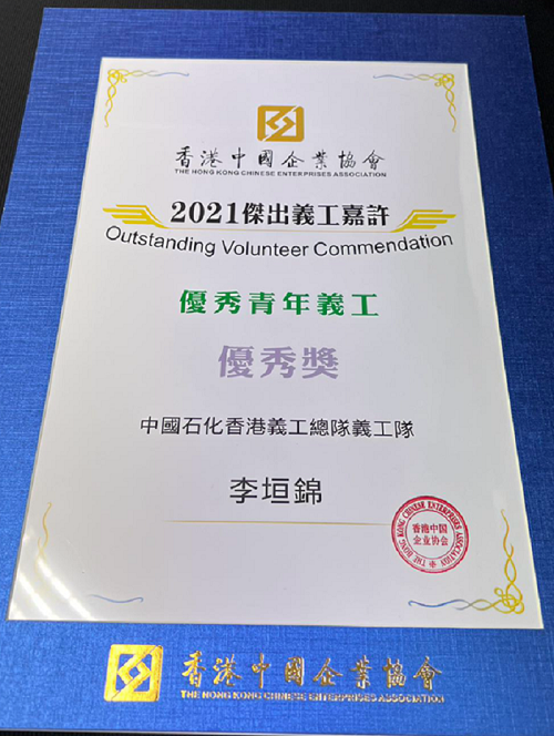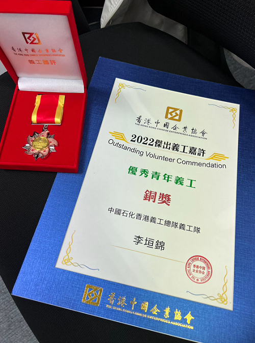 李垣錦堅持不懈參與義工活動,受到社會各界的肯定,他代表香港公司參與各界商會及義工活動,全年義工服務長達200多小時,榮獲香港義務工作發展局頒發的年度義工金獎;積極參與中石化香港舉辦的各類義工活動,榮獲中企協優秀青年義工、中國石化駐港單位2021年及2022年度優秀義工等榮譽。